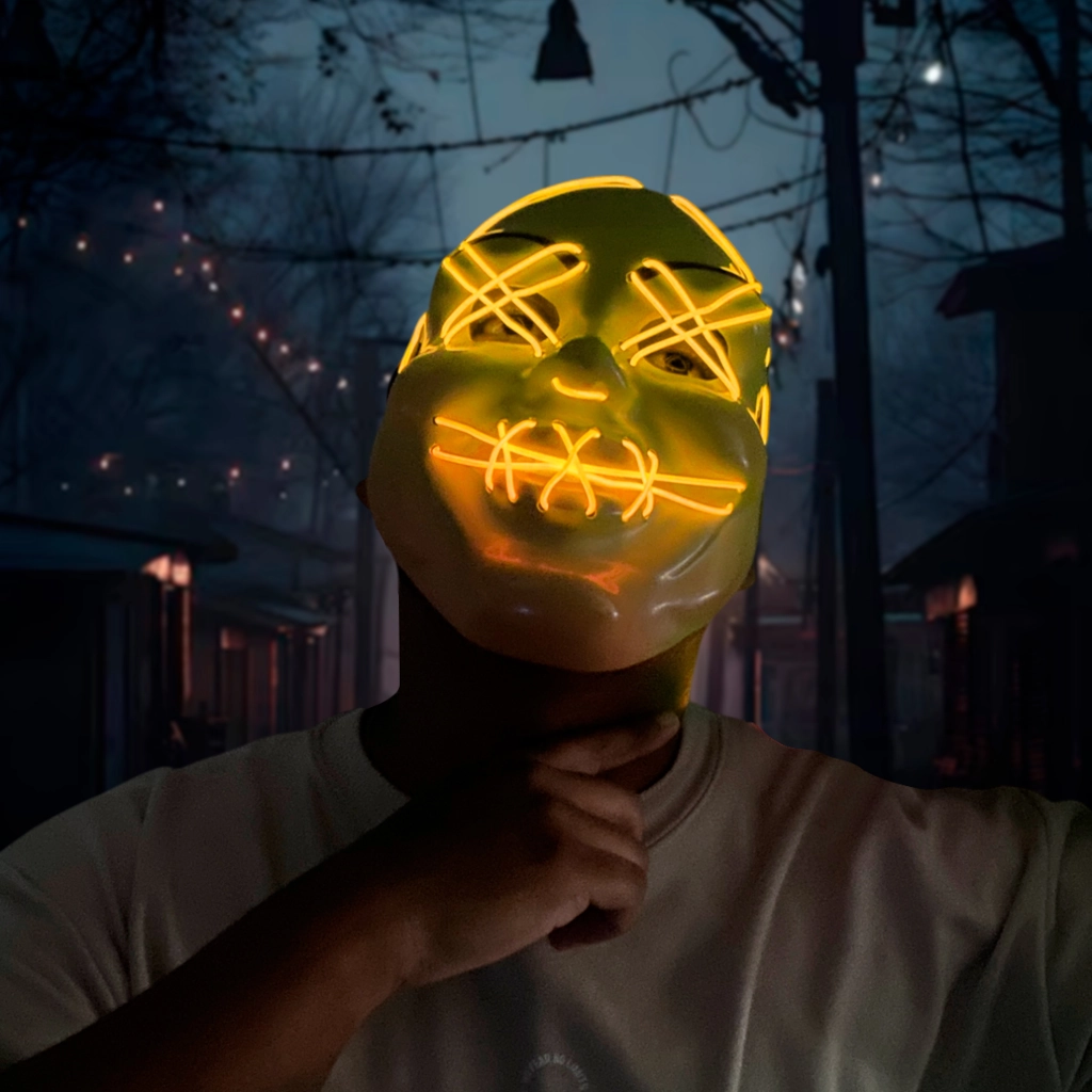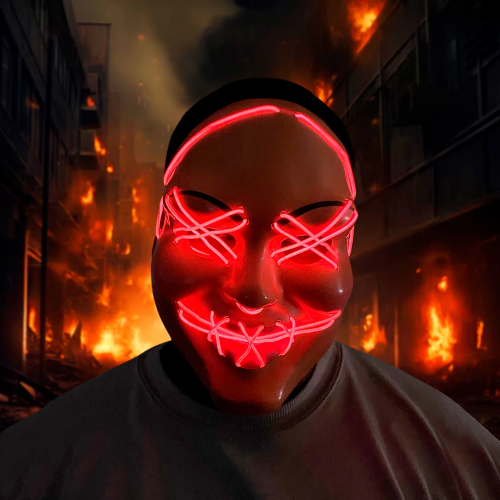 ¡El accesorio icónico para desatar el caos! Esta Máscara LED de la Purga (inspirada en 12 Horas para Sobrevivir) es la pieza central perfecta para un disfraz que garantice ser la sensación de las fiestas en Noche de Brujas y eventos nocturnos.