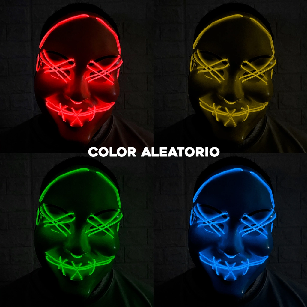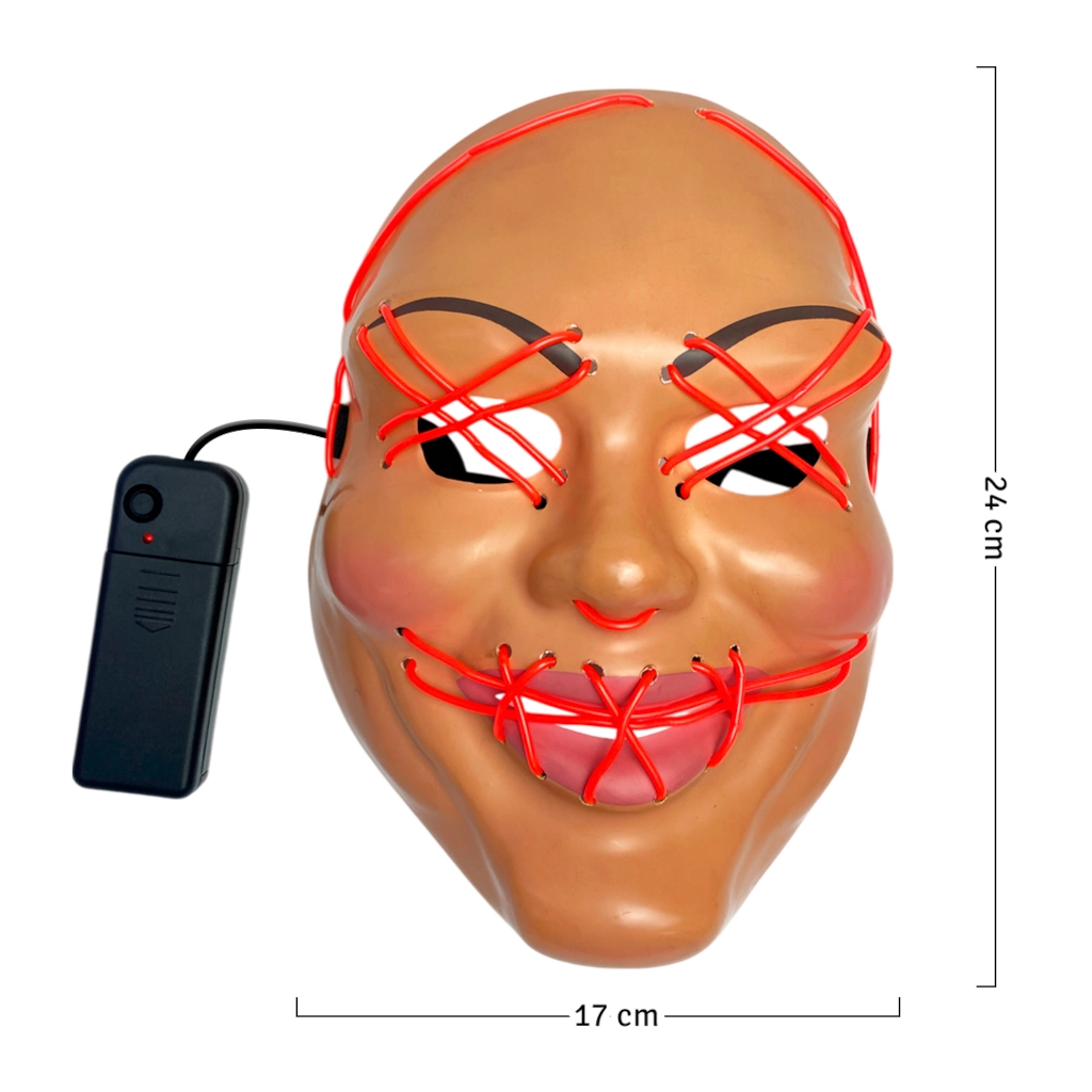 El diseño del rostro, característico de la franquicia, está delineado con un cable LED brillante que emite una luz neón espectacular. La máscara está fabricada con plástico duradero, mientras que la luz fría integrada no tiene daño UV, no tiene efectos adversos en el cuerpo humano y funciona casi sin calor, por lo que puedes usarla con seguridad.