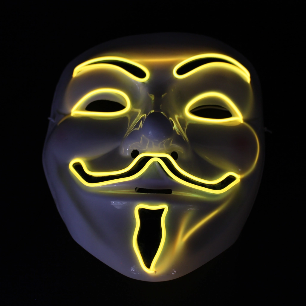 La máscara está fabricada con un material duradero y cuenta con un cable de luz LED de neón que delinea los rasgos clásicos del personaje, creando un efecto visual espectacular y llamativo. Es ideal para fiestas nocturnas, discotecas, festivales de música, Halloween o cualquier evento de cosplay donde quieras ser el centro de atención.