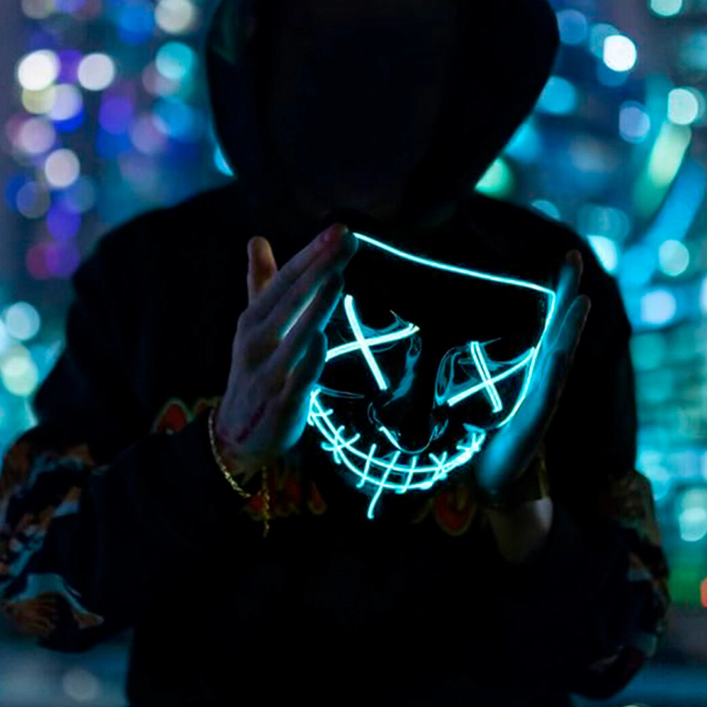 Esta espectacular máscara es de color blanco con el diseño del rostro de asesino y está delineada con un cable de luz fría LED azul brillante que resalta sus rasgos. La luz no tiene daño UV, NO tiene efectos adversos en el cuerpo humano, y funciona casi sin calor, por lo que puedes usarla de manera segura.