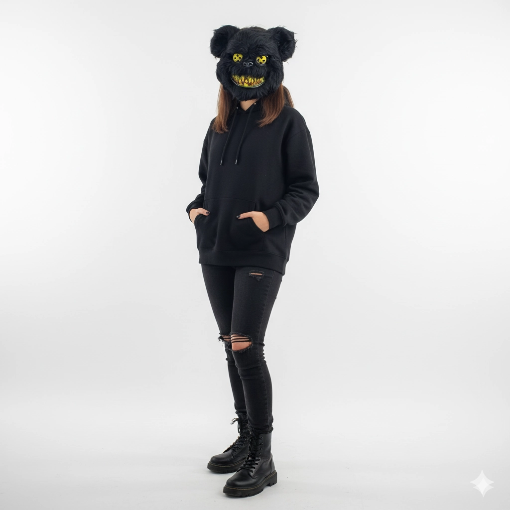 - Diseño Único: Oso terrorífico en color negro, ideal para un disfraz estilo La Purga o temática de animales de terror.