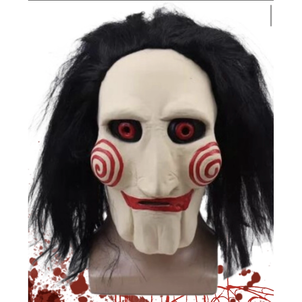 Capturando todos los detalles icónicos del personaje Billy the Puppet, esta máscara presenta un rostro de color hueso pálido, ojos rojos inyectados en sangre y las famosas espirales rojas en las mejillas. La pintura labial roja, fina y malévola, junto con la cabellera negra despeinada, completan este look aterrador y clásico.