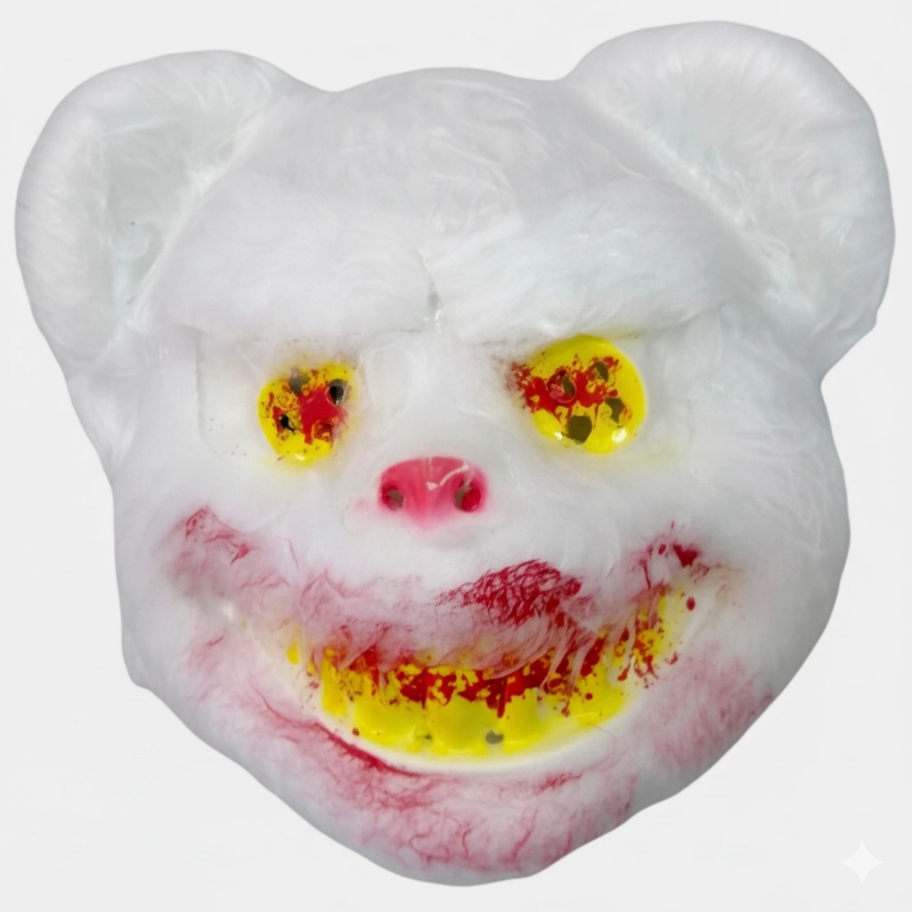 La máscara presenta un diseño de cabeza de oso con un aspecto completamente macabro: un rostro desfigurado con ojos penetrantes y detalles de sangre y heridas que la hacen lucir recién salida de una matanza. El uso de pelo sintético y la pintura detallada realzan el aspecto auténtico y grotesco del terror.