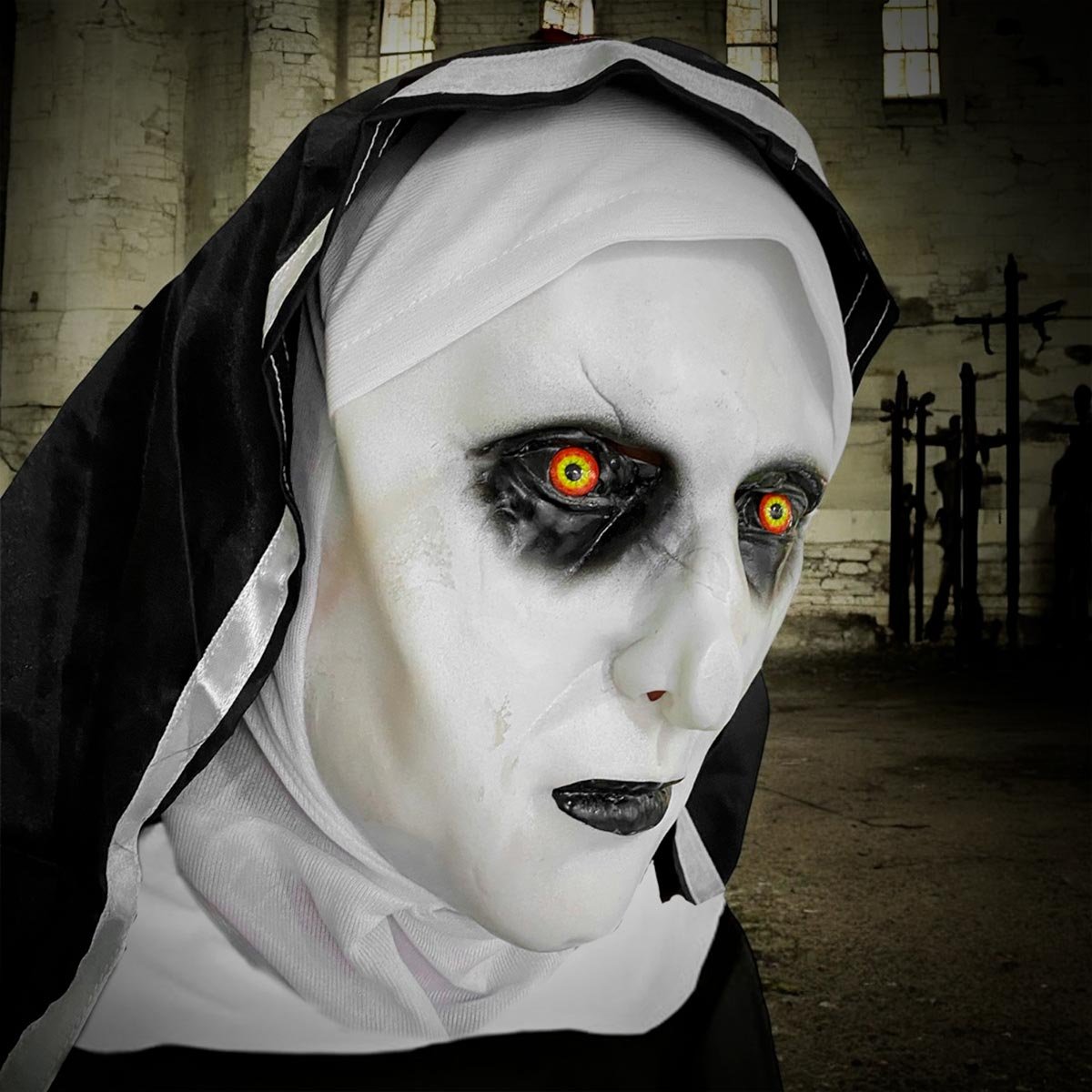 ¡Prepárate para aterrorizar a todos! Con esta escalofriante máscara de La Monja, te convertirás en el demonio Valak de la famosa saga de terror El Conjuro. El diseño, lleno de detalles demoníacos como el rostro pálido, los ojos penetrantes y los labios oscuros, es el complemento ideal para tu disfraz de Halloween o cualquier evento de terror.