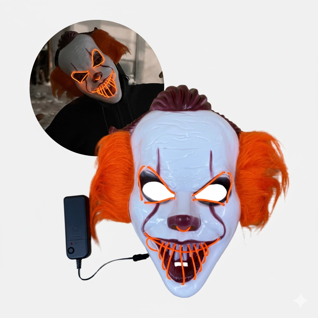 El diseño está basado en el temido payaso Pennywise y cuenta con un cable LED brillante de luz fría que delinea sus rasgos macabros. La máscara está hecha de plástico duradero y el cable LED no tiene daño UV ni efectos adversos en la piel, permitiéndote usarla de manera segura y cómoda.
